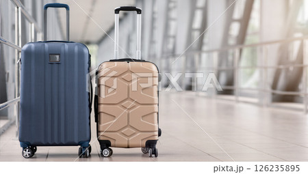 Two stylish suitcases standing in empty airport hall, unrecognizable traveller's luggage waiting in terminal, creative banner for air travels or vacation trip, panorama with copy space