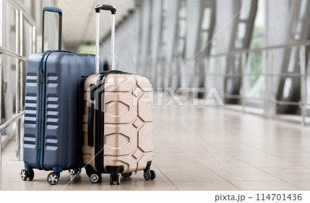 Travel Fashion. Closeup Shot Of Two Plastic Suitcases Standing At Empty Airport Corridor, Stylish Luggage Bags Waiting At Terminal Hall, Banner For Air Travelling And Vacation Booking Concept
