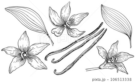 Vanilla Flower with Sticks set. Vector hand drawn illustration of orchid Flower and pods on isolated background. Bundle with outline drawing of spice. Sketch in line art style painted by black inks.