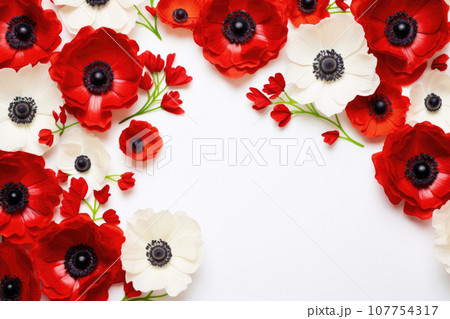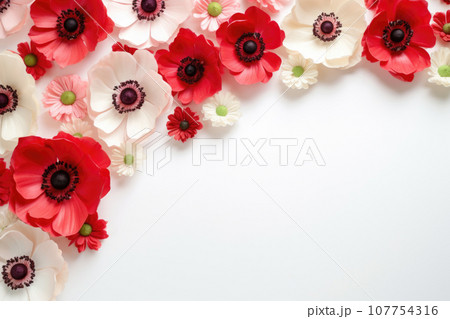 Red and white anemon flowers on white background top view with copy space