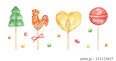Set of watercolor lollipops on a stick. Christmas tree, heart-shaped lollipops, candy cockerel, round sugar lollipops on a stick. Collection of lollipops, clipart. Illustrations for children printing.