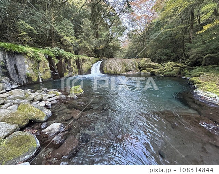 日本の川景色:熊本県の菊地渓谷の菊地川の天狗滝と紅葉