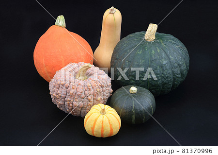 カボチャの集合(バターナッツ、菊かぼちゃ、プッチーニ、黒皮栗カボチャ、コリンキー、鈴かぼちゃ)