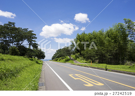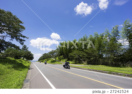 菊池温泉街大平の自然豊かな直線道路透き通った青空と白い雲の下二輪車バイクツーリングライダー達快適