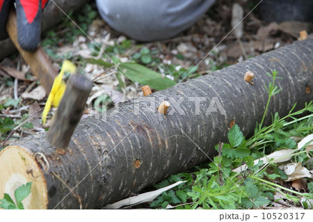 自然林の倒木に天然自生している成長盛りの椎茸(早春の晴れた日に屋外でマクロ撮影)