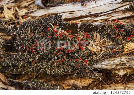 small red mushrooms on tree trunk. vegetation in forest of kazakhstan
