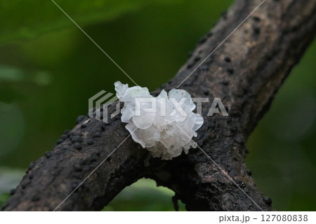 倒木に生えたシロキクラゲと思われる白いゼリーのようなキノコ