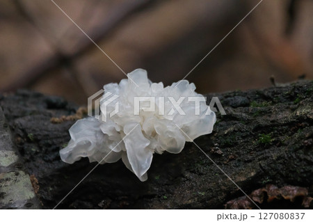 倒木に生えたシロキクラゲと思われる白いゼリーのようなキノコ