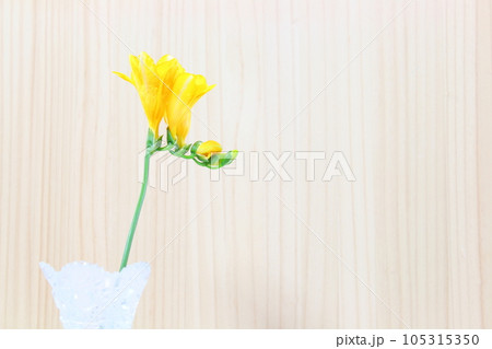 黄色いフリージア・一輪・ラッピング (コピースぺース・白背景)