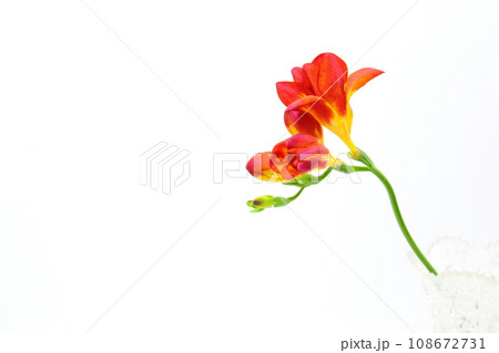 赤いフリージア・一輪・ラッピング (コピースぺース・白背景)