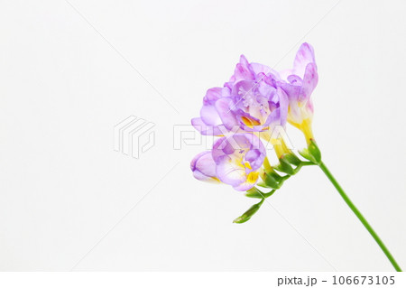紫色のフリージア・一輪【アップ・白背景・コピースペース・シンプル・人物なし】