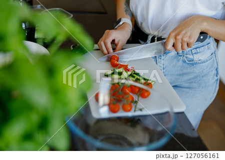 Close-up woman hands chopping cherry tomato on a cutting board, preparing healthy salad with fresh arugula leaves, standing at kitchen counter. Culinary, diet, healthy eating and food concept