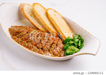 Eggplant spread served with toasted bread slices and fresh cilantro