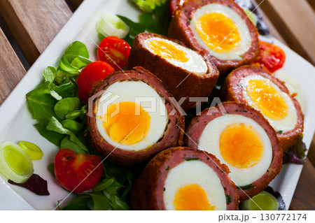 Scotch eggs with greens and tomatoes