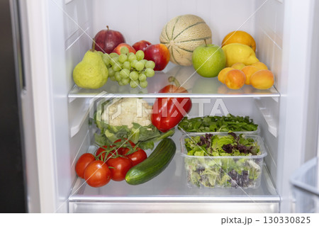 Open refrigerator full of fresh fruits and vegetables promoting healthy eating habits