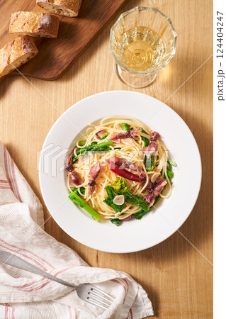菜の花とベーコンのパスタアップ