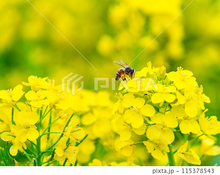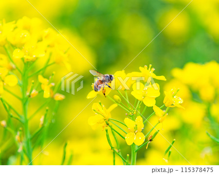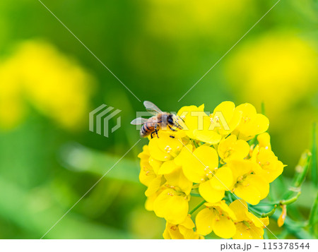 春のたより 満開の菜の花畑で蜜を集めるかわいいミツバチ