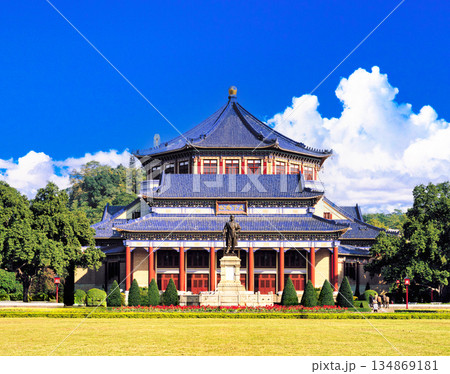 中国・広州の中山記念堂と孫文像の下で咲き誇るお花畑。