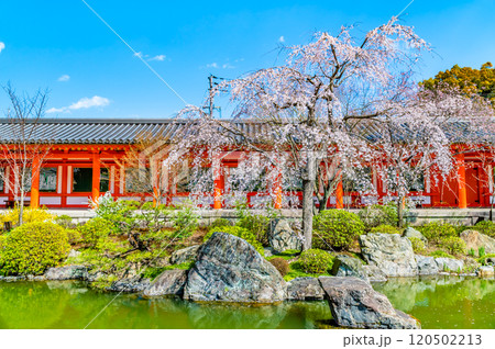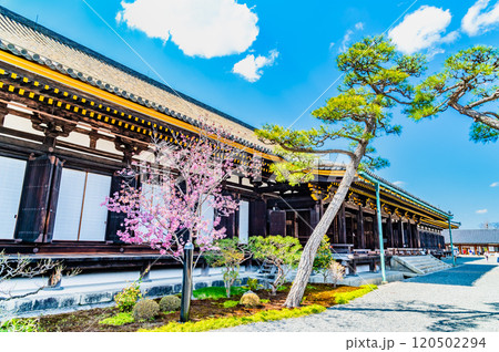 京都 桜満開の三十三間堂 庭園と東大門
