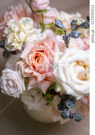Delicate composition of white and pink roses in a basket