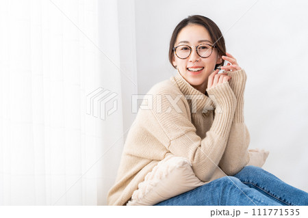 部屋でリラックスするニットを着た美人な女性の秋冬イメージ上半身 萌え袖がかわいいカメラ目線