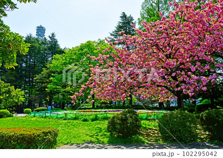 若葉萌ゆる杜の都 仙台 勾当台公園に咲く八重桜