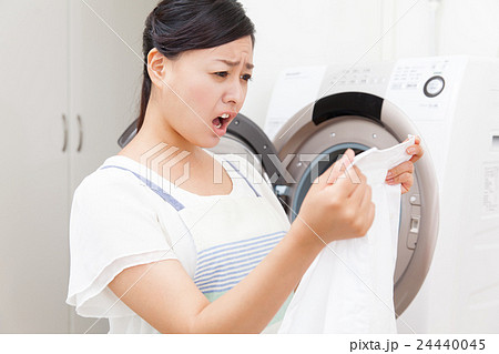 洗濯物の汚れが気になる若い女性