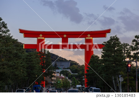 Kyoto Heian Jingu gate at dusk with cars lanterns and trees