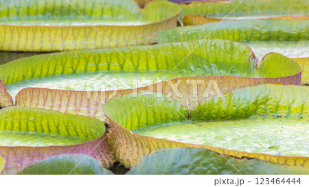 The Historical Botanical Garden La Concepcion in Malaga city at Andalusia, Spain, Europe. Close-up of vibrant green water lily pads, showcasing textures and patterns. Nature's beauty in detail.