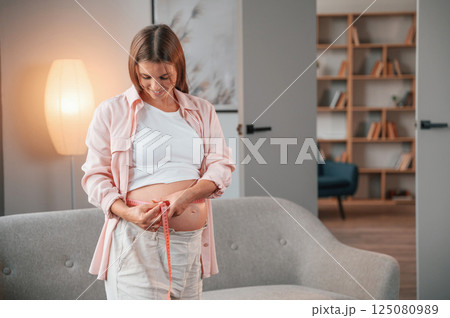 With measuring tape. Around the waist. Beautiful pregnant woman is indoors at home