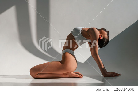 Exercise for the spine. Young caucasian woman with slim body shape is indoors in the studio