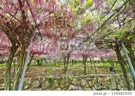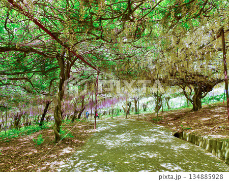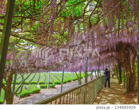 紫色の枝垂れた花が美しい蔓性落葉樹の藤棚