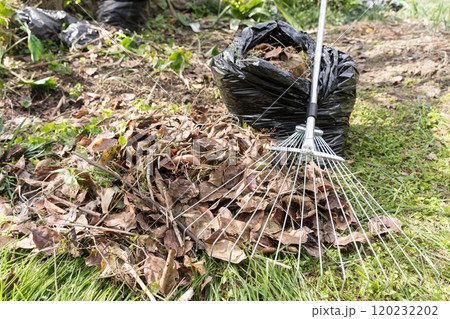 落ち葉と集めた熊手と野球のボールがある公園の風景