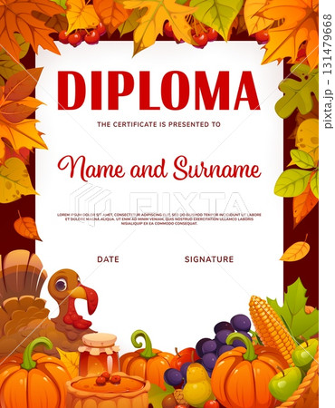 Festive Thanksgiving diploma frame decorated with autumn fall season leaves, pumpkins and grapes, honey and corn, fruits, pie and turkey. Vector Certificate layout perfect for school or holiday awards
