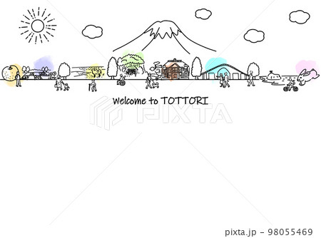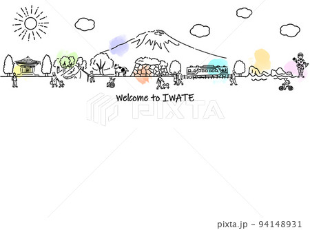 岩手県の観光地の街並みと人々のシンプル線画イラスト