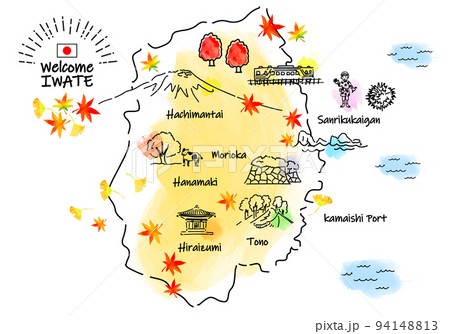 冬の宮城県の観光地のシンプル線画イラストマップ