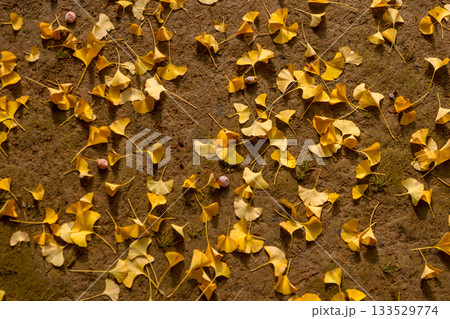 秋の風物詩 地面一面を黄色に染めたイチョウの黄葉と銀杏