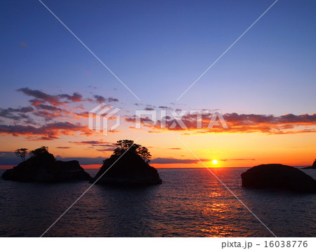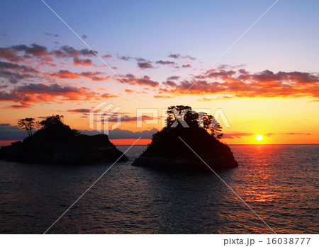 夕暮れの日本海と夕陽(夕日) 新潟県村上市