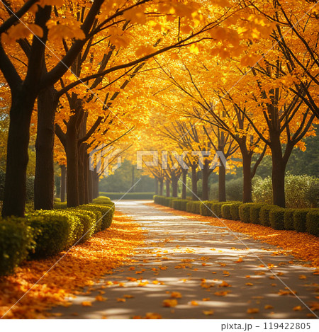 風景自然植物写真 秋の日向ぼっこ 明るい秋の始まり 落ち葉のある椅子の風景