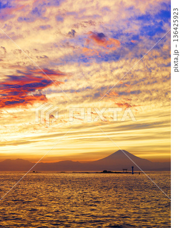 秋の夕焼け空に浮かぶ富士山シルエット 葉山真名瀬海岸の海景色