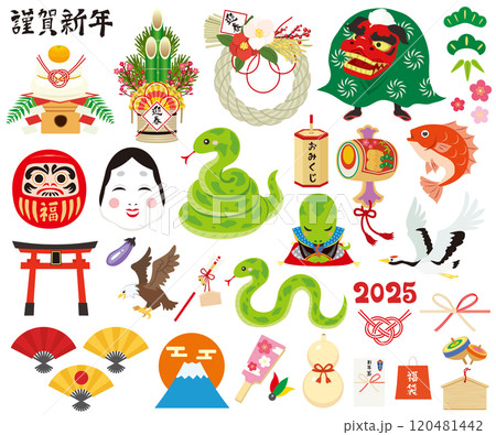 正月モチーフの手描きイラストセット シンプルな年賀状素材集