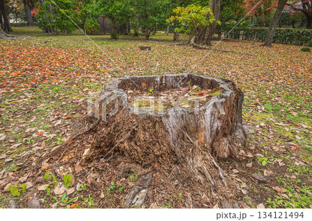 晩秋の京都御苑の樹林風景 朽ちた大木の切り株 京都市