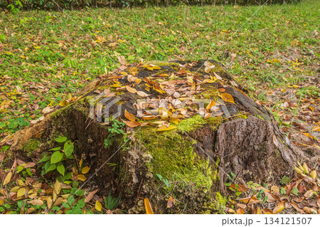 切り株に散り積もる落ち葉 京都御苑 京都市