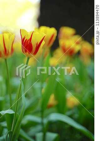 field of red tulip flowers in the garden in spring. Beautiful natural floral background