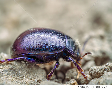 Macro photo of a shiny Timarcha beetle resting on a green leaf. Detailed view of this ground-dwelling insect.