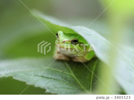 葉陰でくつろぐアマガエルクローズアップ