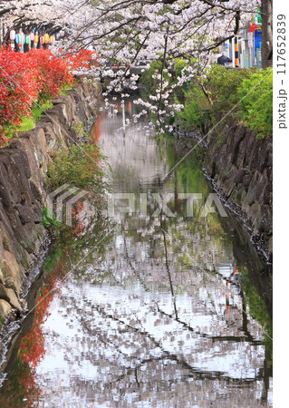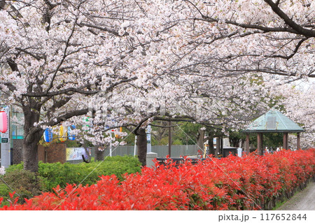「葛西用水桜通り」 満開の桜並木とカナメモチの赤い若葉