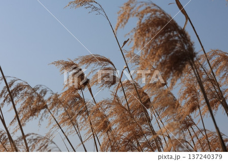紅葉した水辺の葦(ヨシ)の穂