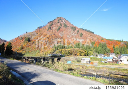 秋の只見線 紅葉に染まる蒲生岳と三連気動車
