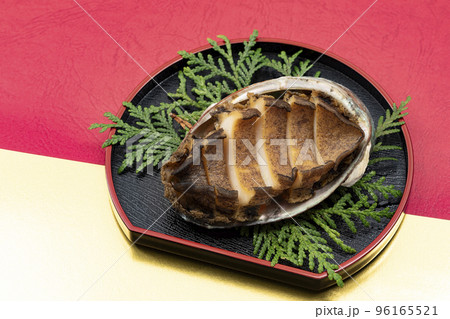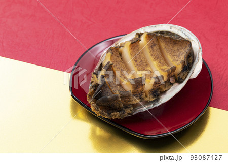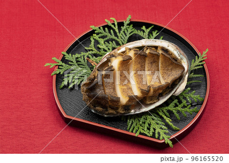 おせち料理その5_殻付きのアワビの酒蒸し_背景赤